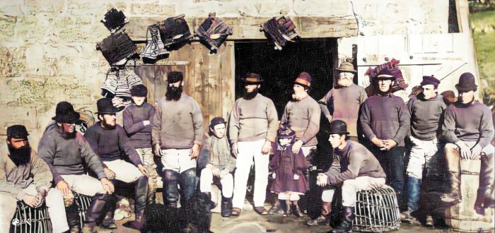 Left to right: John Rowe, Thomas Jackson, John Jackson, William Jackson Jnr, Matthew Jackson, Alfred Jackson, Richard Rowe, William Jackson (Snr), Ethel Jackson, Mr. Thompson, a visitor (sitting on crab pot), Robert Jackson (Snr), Robert Jackson, John T Jackson, James Jackson